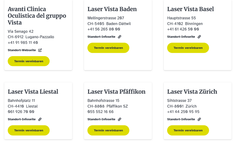 Mit zahlreichen Standorten schweizweit verfügt die Vista über ein breites Netzwerk an Augenkliniken und Augenpraxen. An allen Standorten bieten spezialisierte Augenärzte sämtliche Behandlungen und Eingriffe rund um das Auge an.